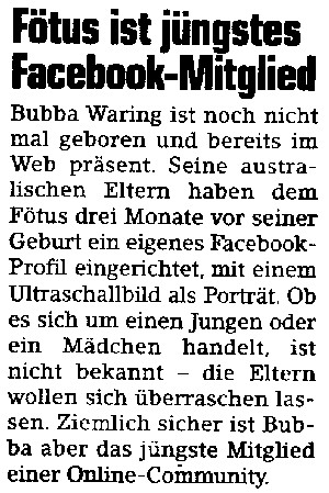 Hier aber nun ein wirklich sehr sinnloser Bericht über eine Webseite die für ein Kind das noch nicht auf der Welt ist….WOW, Shayenne meine kleine Tochter hatte dies ebenfalls, kaum war klar das meine Frau Schwanger war und sicherlich gab es schon hunderte Webpages zuvor bei denen dies ebenfalls der Fall war, aber nein nun nach 15 Jahren Internet kommt eine solch Schwachsinnige Meldung in der Zeitung….na toll.